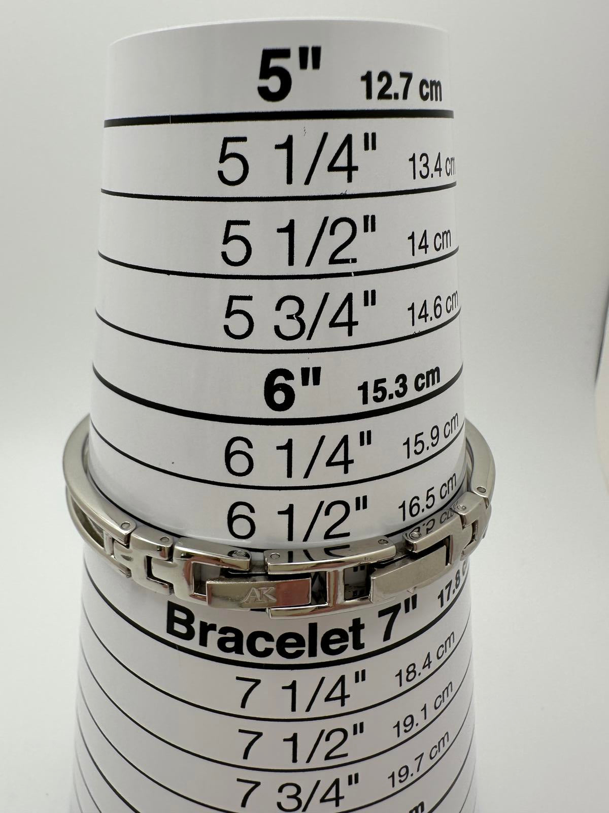 Bracelet: Polished stainless steel with clasp closure