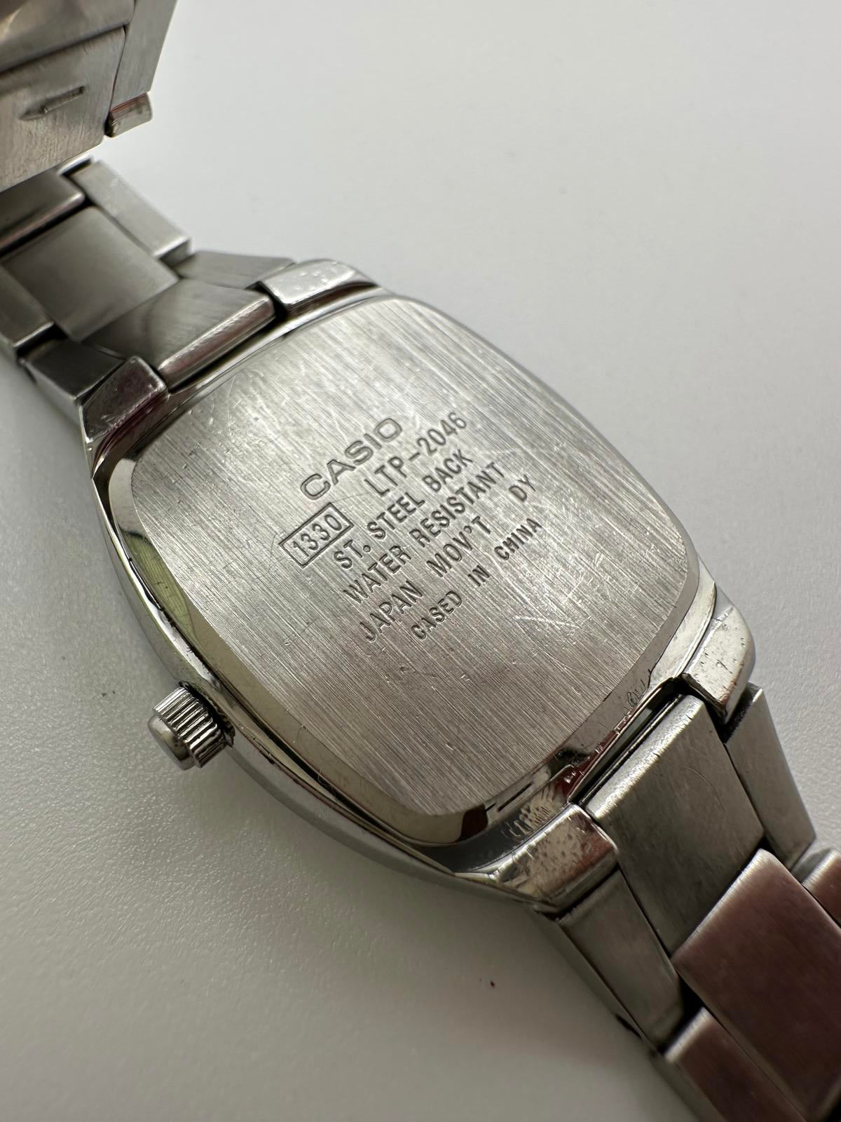 Classic Casio women’s quartz wristwatch, model LTP-2046. Featuring a polished stainless steel case and bracelet with a soft light blue dial, accented by crystal markers at 12 and 6. Square cushion case design with a 23mm diameter for a refined, elegant look.