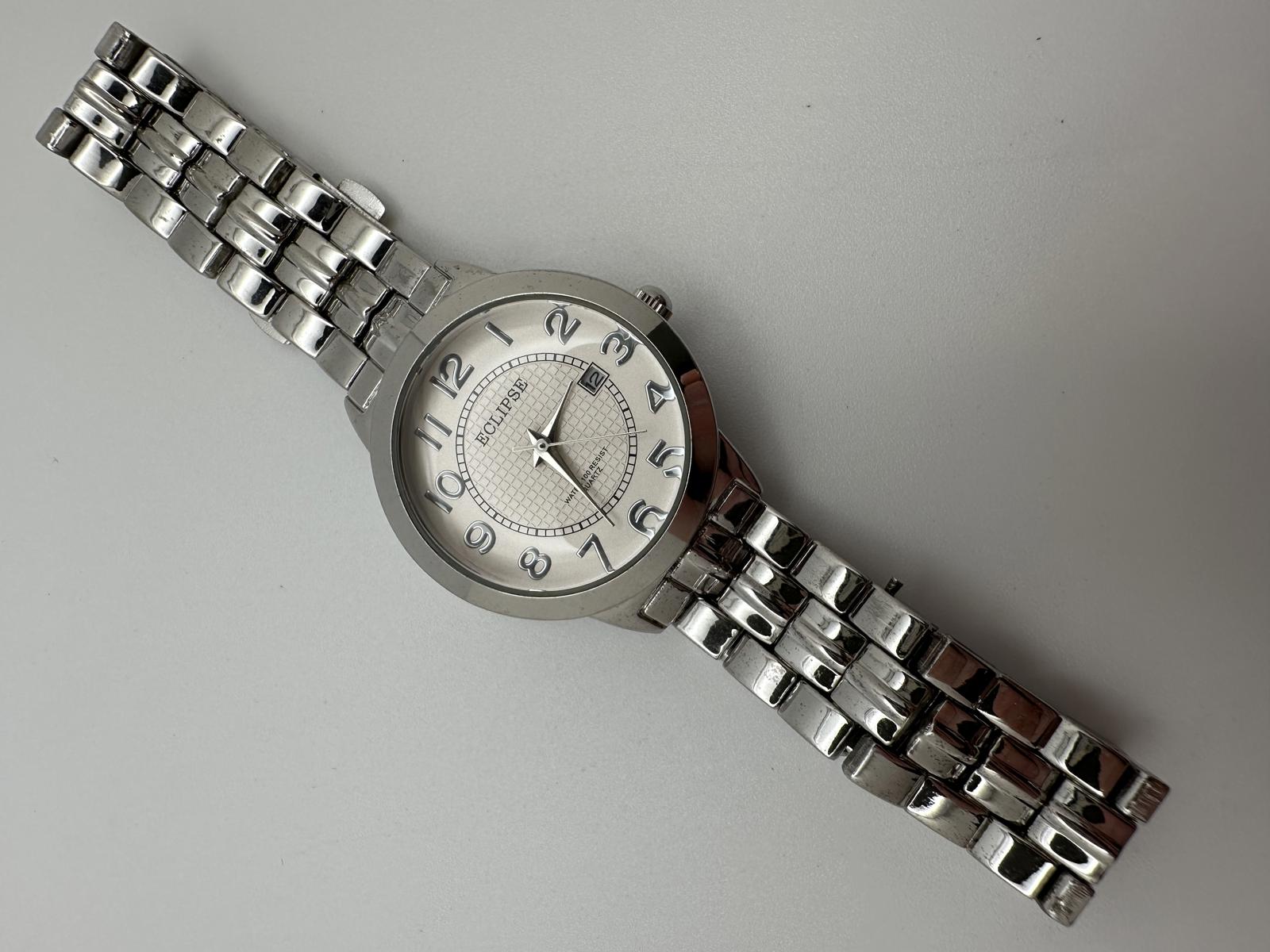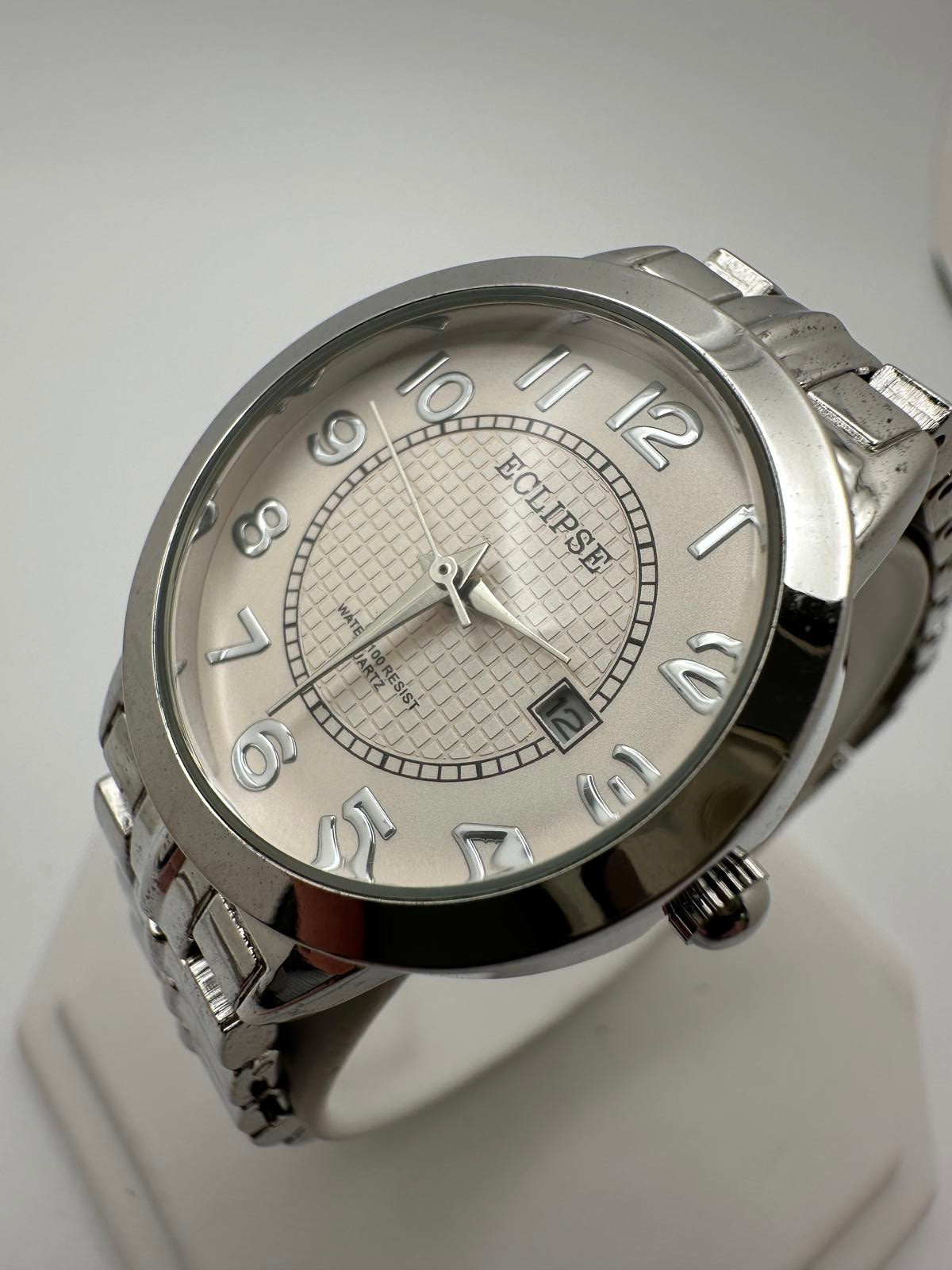 Classic Eclipse women’s silver-tone watch with a clean 30mm case and a textured silver dial. Easy-to-read raised numerals, date window at 3 o’clock, and a smooth quartz movement with a fresh battery installed.