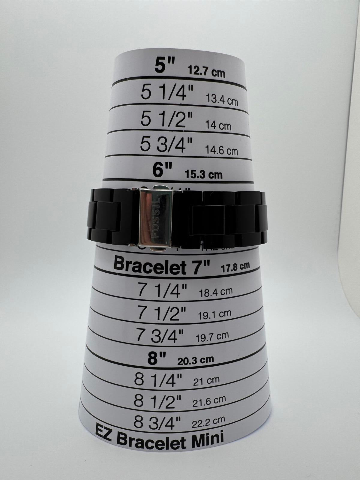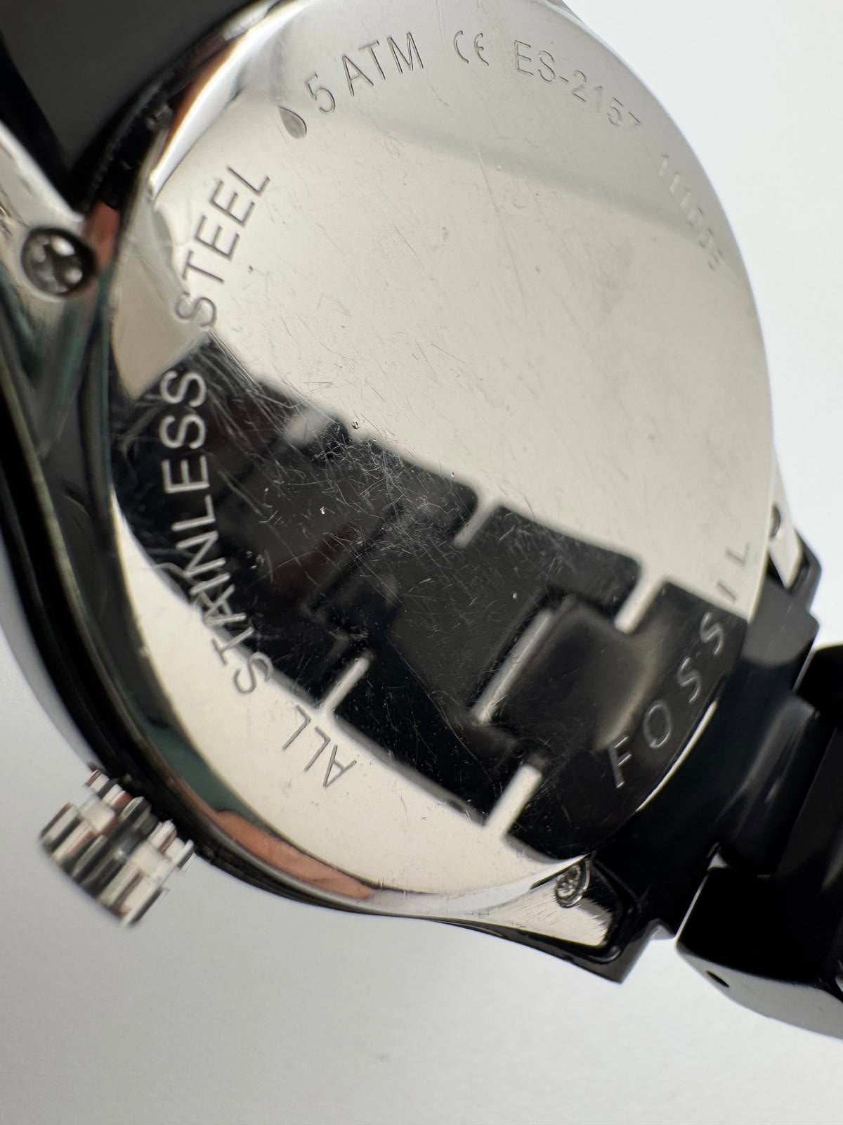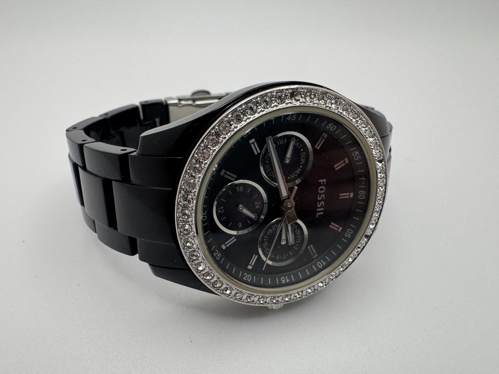 Stylish Fossil black ceramic-look watch with crystal bezel and multifunction subdials. New battery installed and tested — keeps accurate time. Features day, date, and 24-hour displays. Light wear from use, crystal and dial look great. Perfect mix of shine and everyday wearability.
