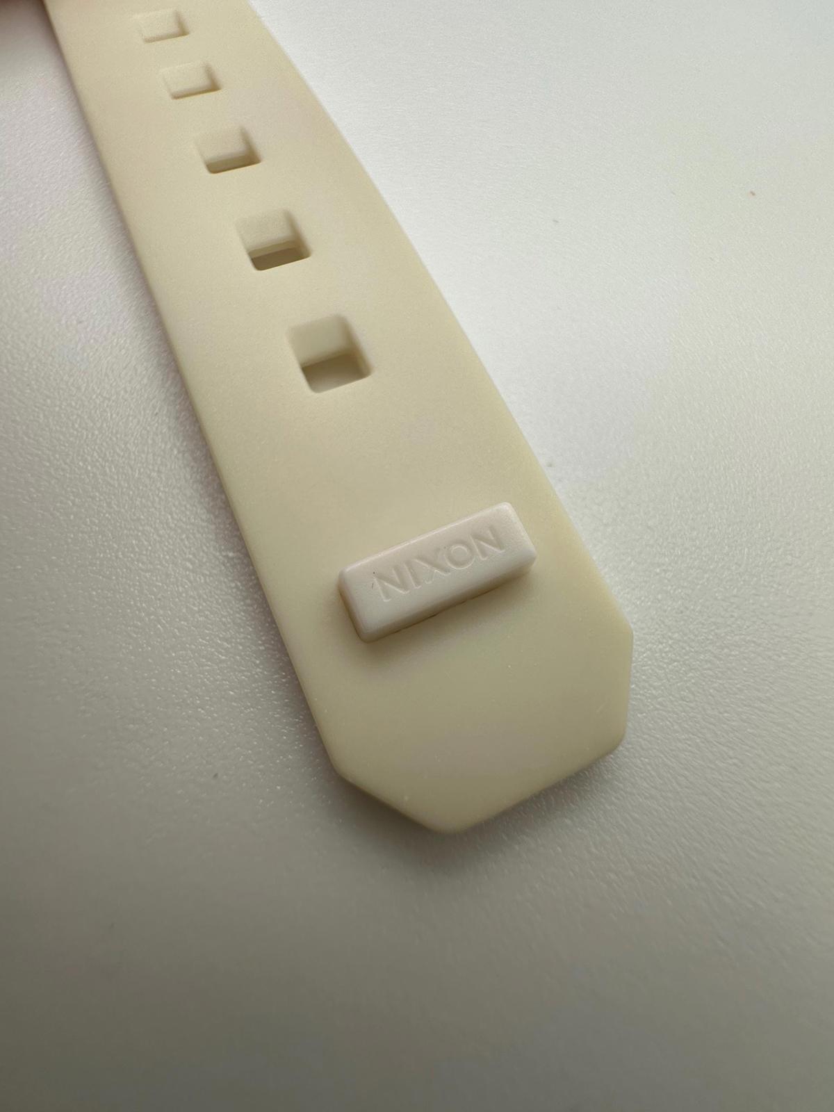 Nixon Small Time Teller P women's watch in soft cream with a clean minimalist dial. Lightweight polycarbonate build with Japan movement. Fresh battery installed and keeping time well. Water resistant to 100M. Great everyday style.
