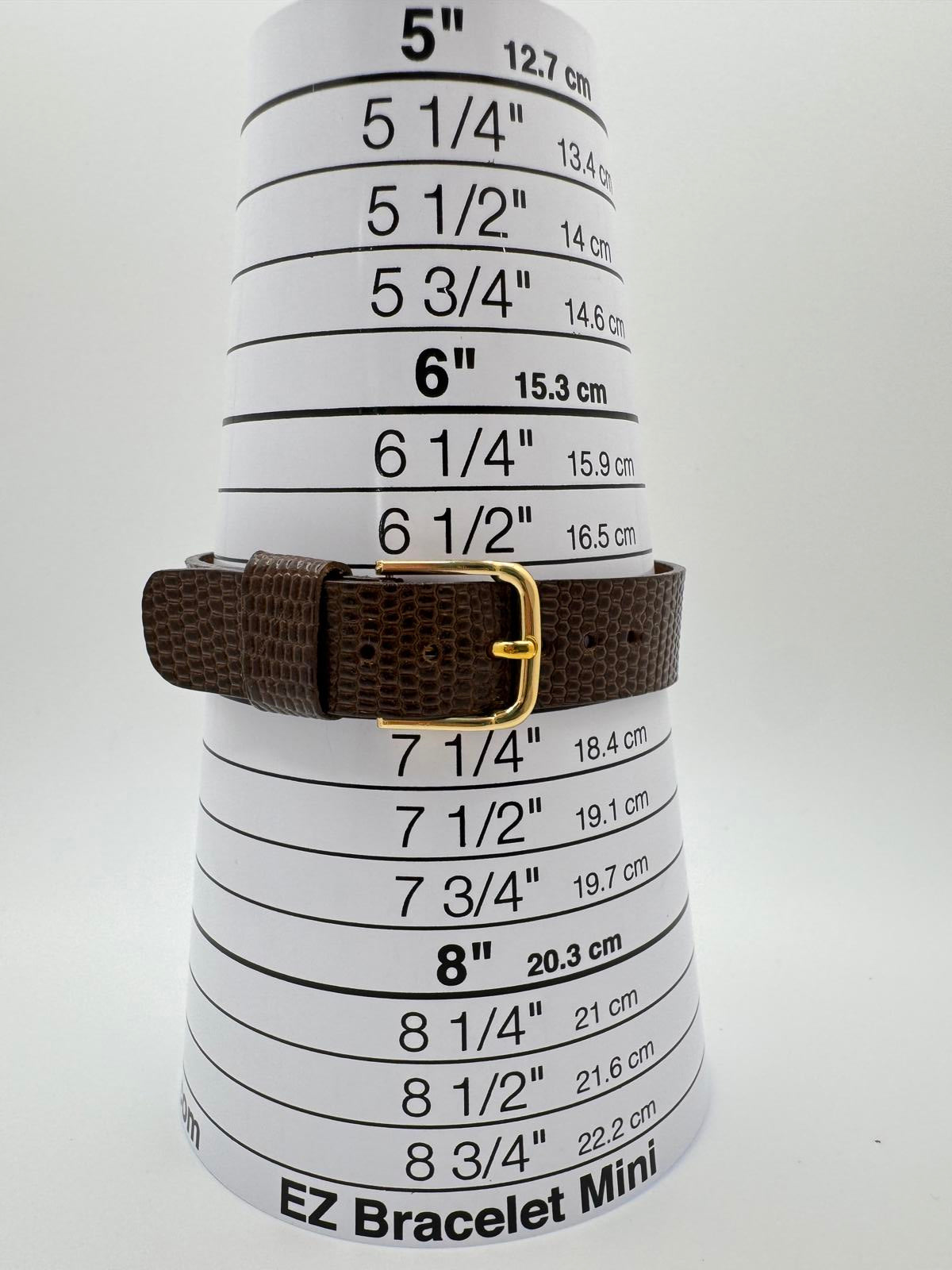 Genuine brown lizard-grain leather strap (16mm, minimal storage curl)