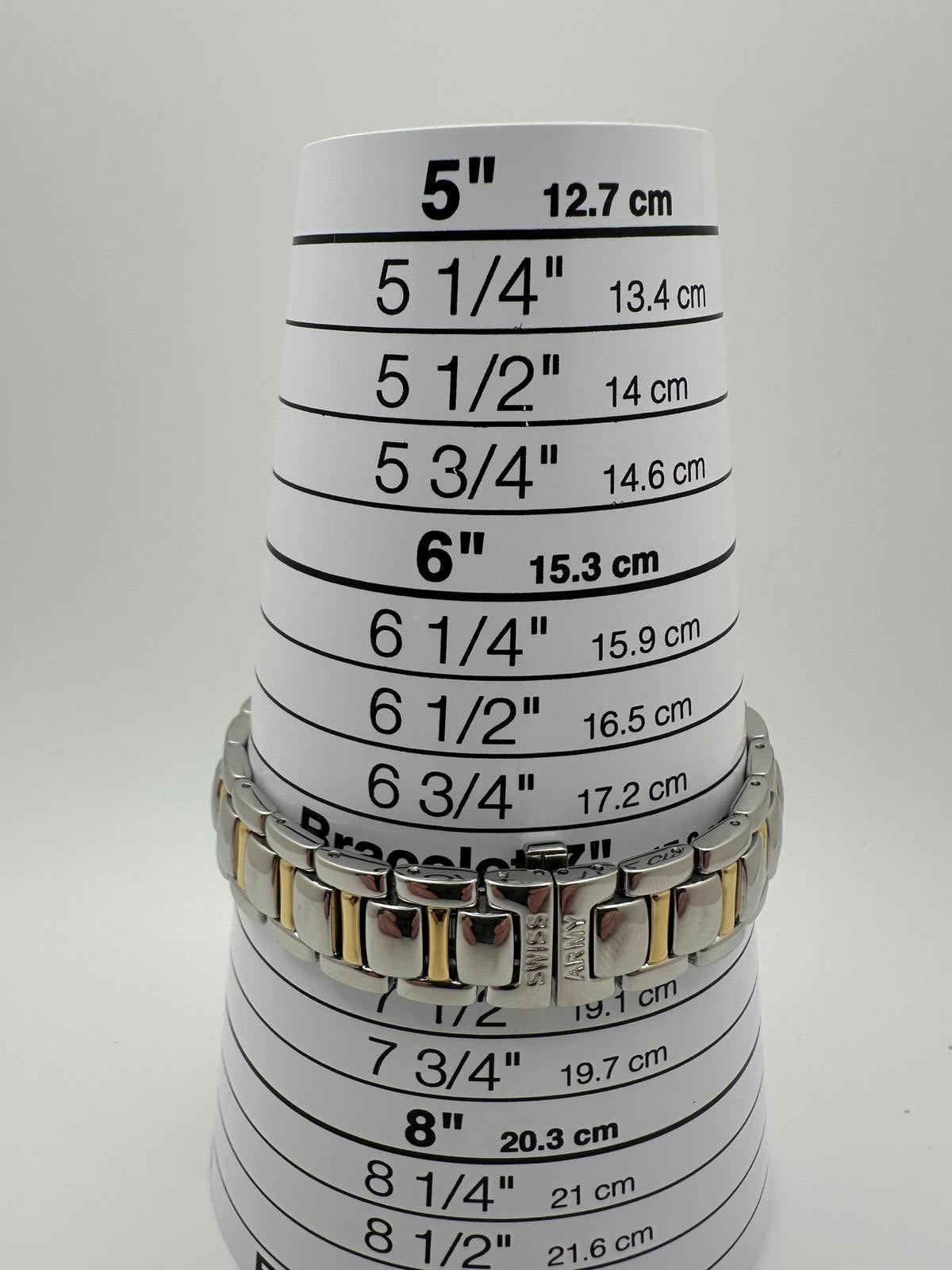 A beautiful Swiss Army women’s two-tone quartz watch with a bright silver dial, gold bezel accents, and a polished stainless bracelet that still pops with brilliant shine. Classic 26mm case — elegant, petite, and easy to wear with anything.