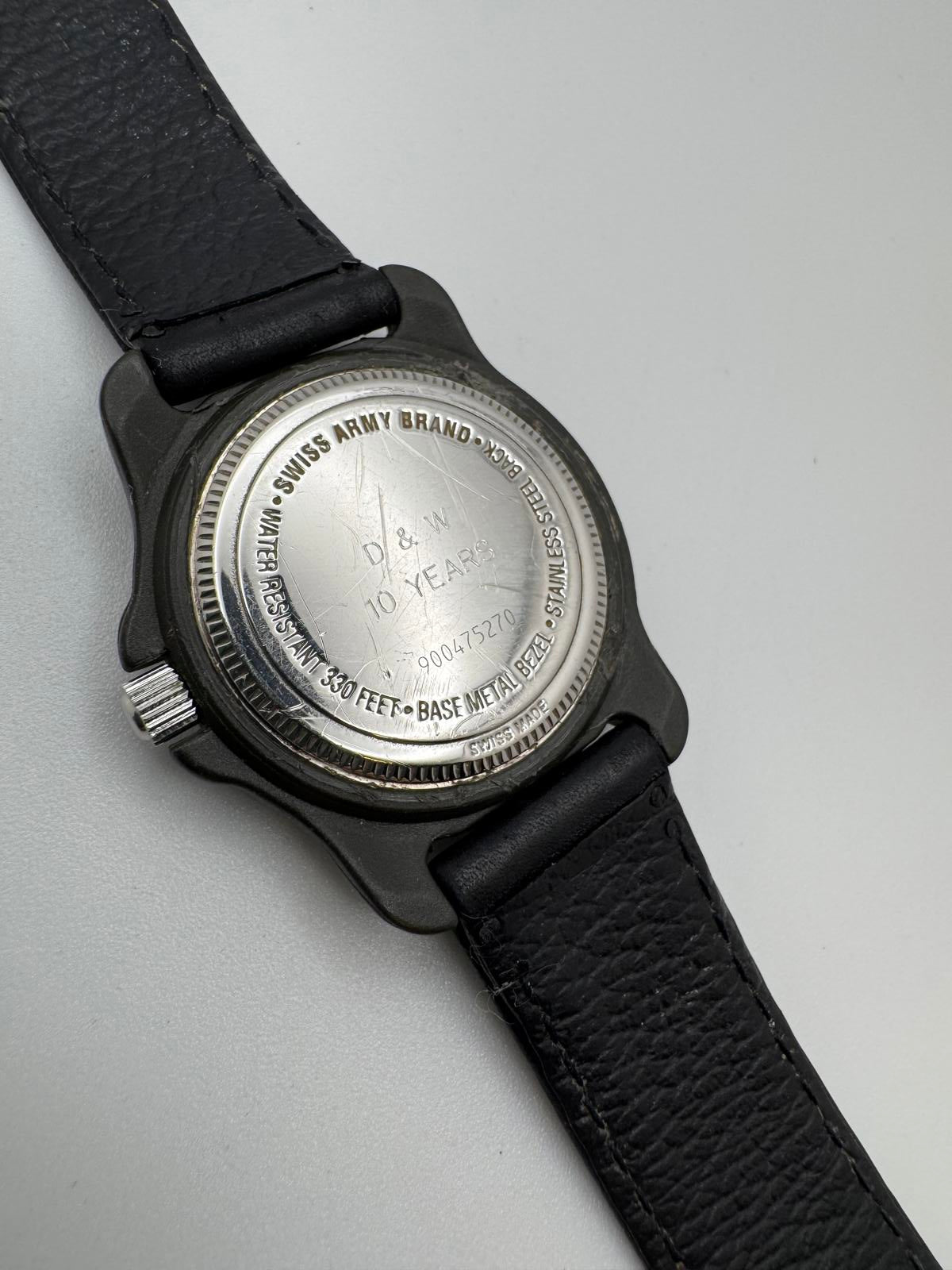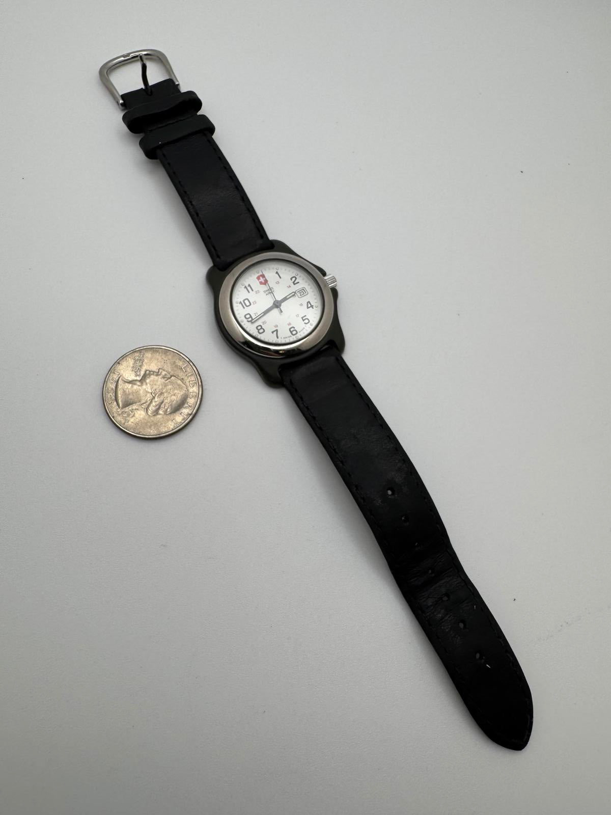 Classic Victorinox Swiss Army wristwatch with a clean and functional design. Features a 30mm stainless steel case with black resin guard, white dial with 24-hour markings, and date window at 3 o’clock. Swiss quartz movement ensures accuracy, and the watch has just been fitted with a fresh battery. Paired with a black leather strap for comfortable everyday wear.
