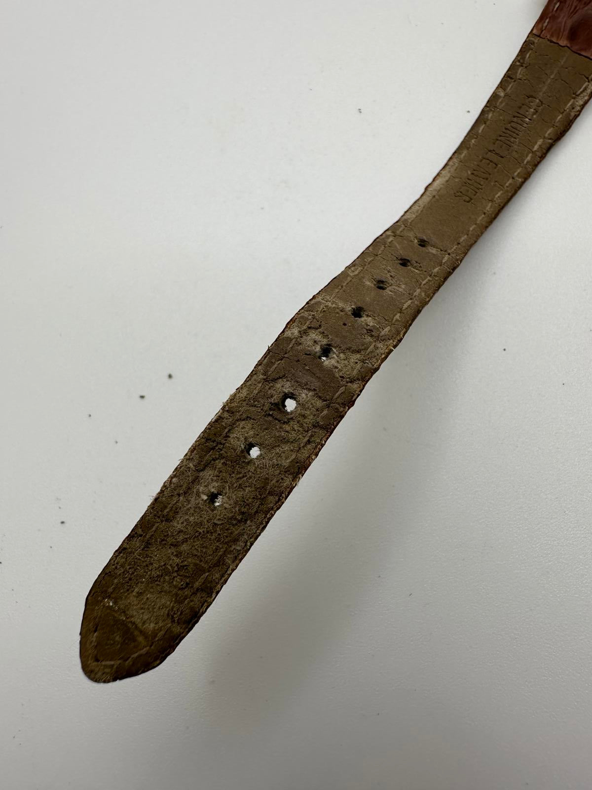 The leather strap is original and comfortable, but the back side shows flaking from age. Still wearable, but expect cosmetic wear. Case shows light surface wear consistent with vintage use.