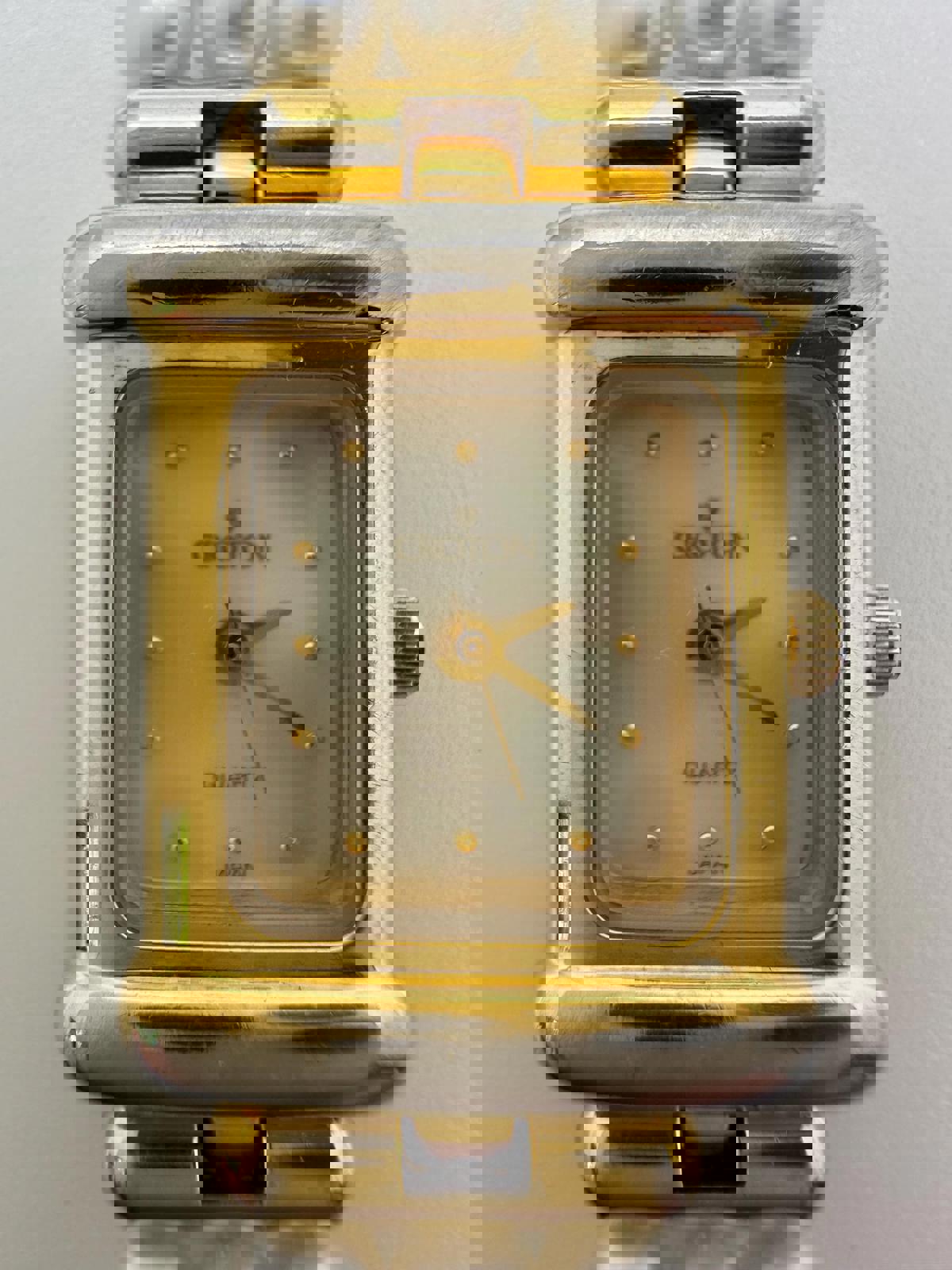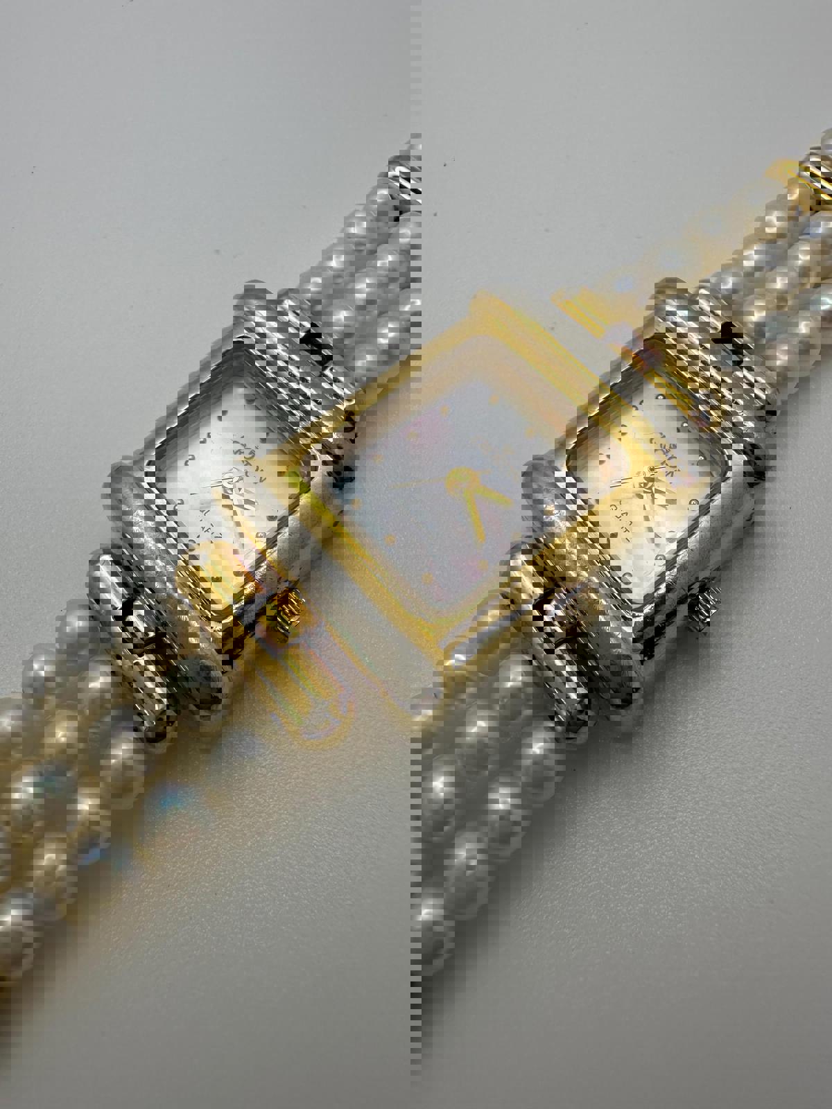 Elegant vintage Croton women’s quartz watch with timeless charm. Features a rectangular gold and silver-tone case, genuine mother of pearl dial, and gold dot hour markers. The triple-strand faux pearl bracelet is accented with gold-tone spacers, adding a touch of sophistication. Japan quartz movement with stainless steel back. Light wear consistent with age, fully functional with a fresh battery installed. Perfect for dressy occasions, weddings, or vintage jewelry collections.