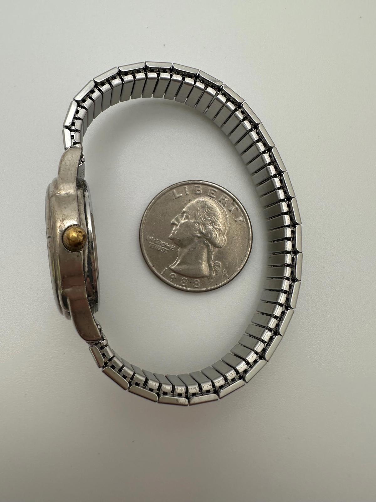 The stretch stainless steel band makes it easy to slip on and off, perfect for everyday use. This piece shows some wear—light scratches, surface marks, and patina on the crown—but nothing that takes away from its vintage charm.