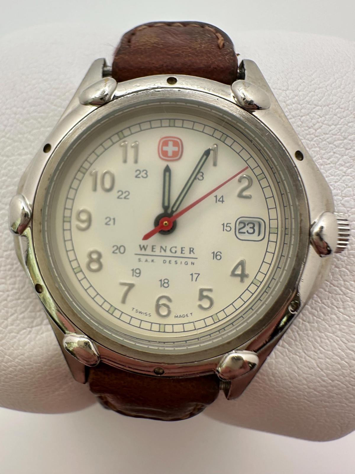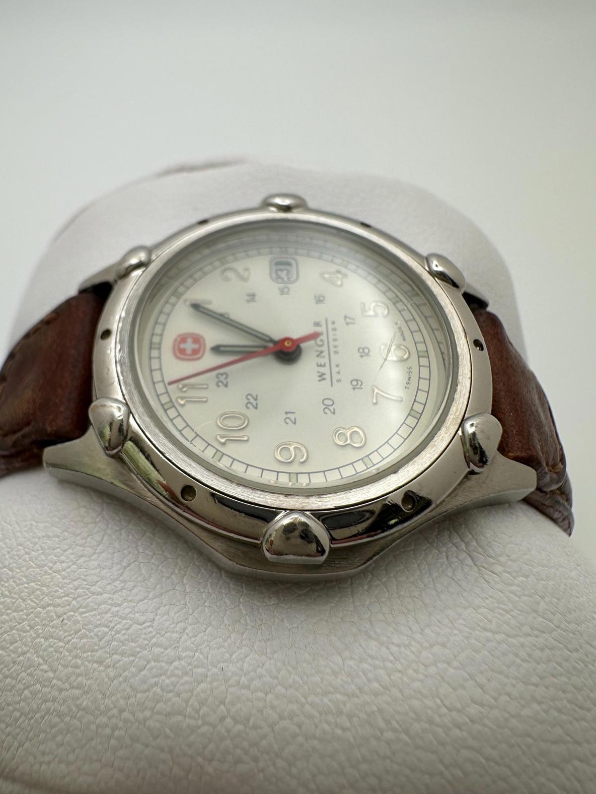 Vintage Wenger Swiss Military watch with timeless field styling and clean Swiss craftsmanship. Features a 30mm stainless steel case (without crown), luminous hands, date window, and a genuine Wenger leather strap. Original buckle with Swiss cross emblem still intact. The dial has a charming aged patina, and the crystal and case show light wear consistent with vintage use. Leather band is 14mm wide, total watch length is approx. 8.5 inches. Water-resistant to 100m and powered by a quartz movement (new battery).