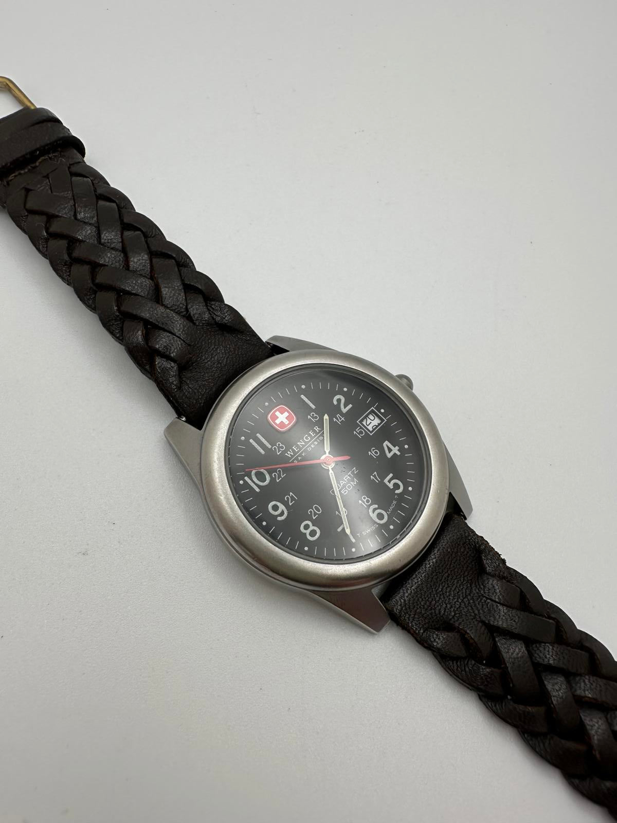 Authentic Wenger Swiss quartz field watch with a clean black dial, bold Arabic numerals, and classic military styling. A practical, no-nonsense everyday watch from a respected Swiss brand.